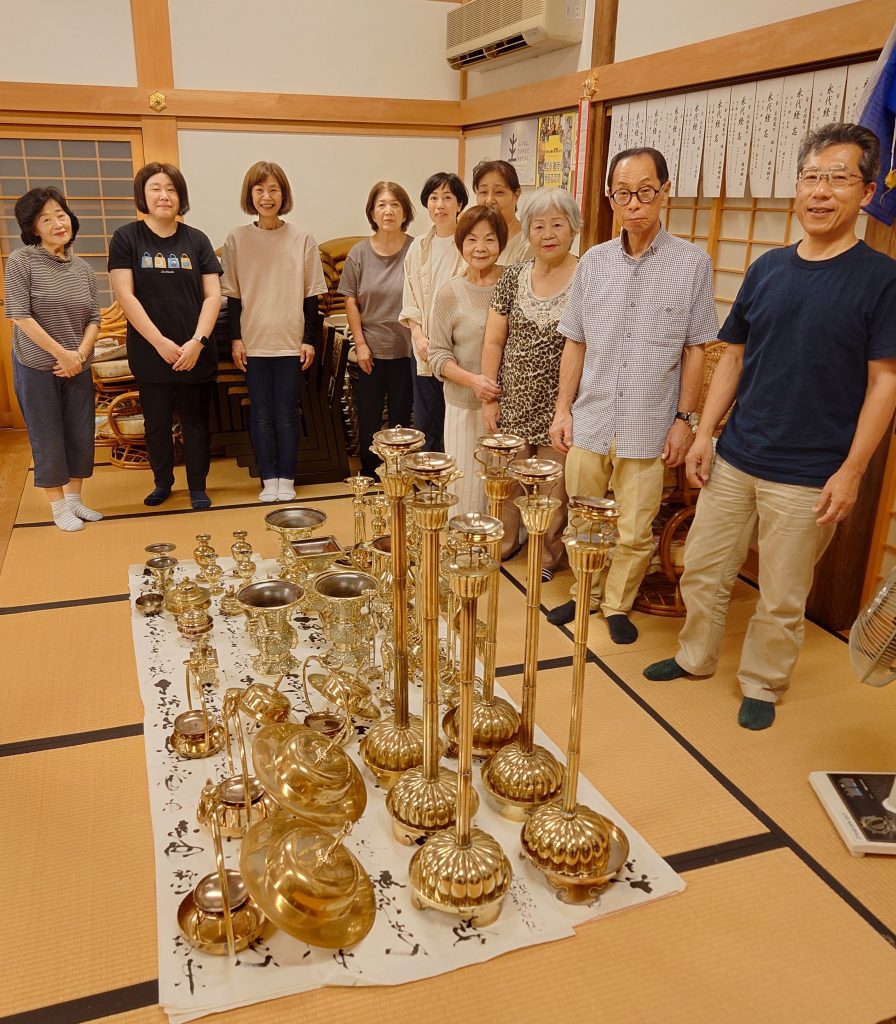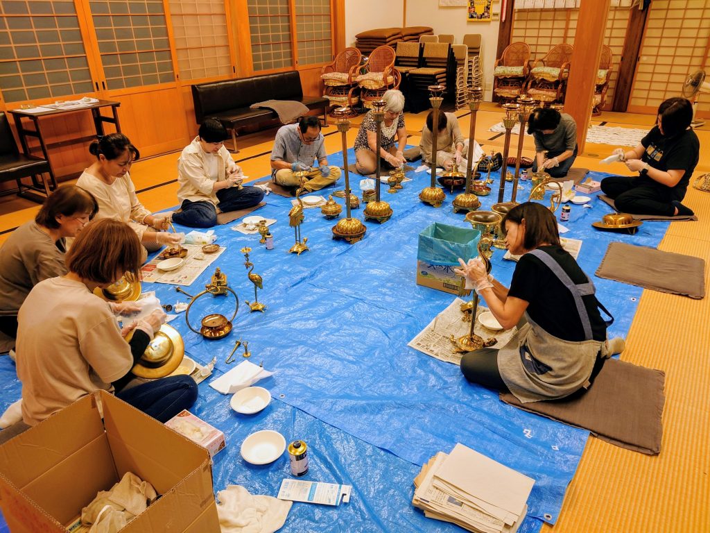 鶴亀や華瓶、輪灯などのたくさんの真鍮仏具を専用の磨き液を使って1時間余り、懸命に磨き上げてくださいました。お陰様でピカピカに仕上げていただき、間もなくの報恩講をお迎えする事ができます。