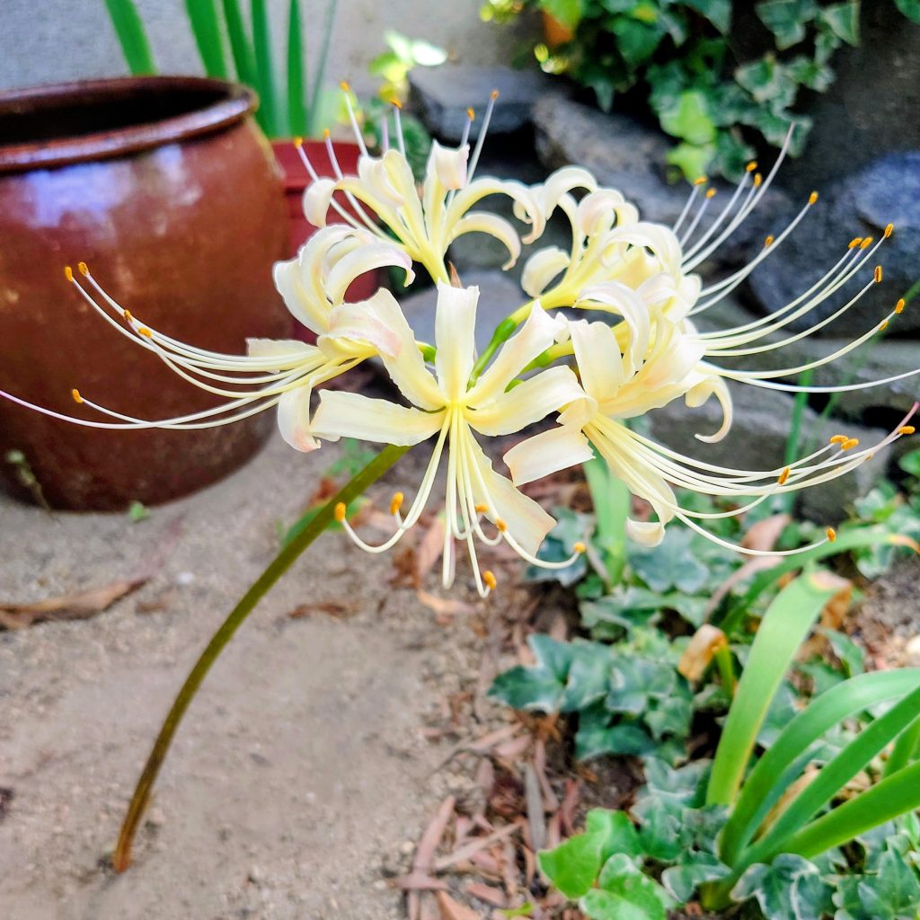 暑く長かった夏もお彼岸の声とともに一気に秋めいてきました。ほんとにやっとです。高温が続いた影響か、いつもはきちんとこの時期に咲く彼岸花がやっと咲きました。