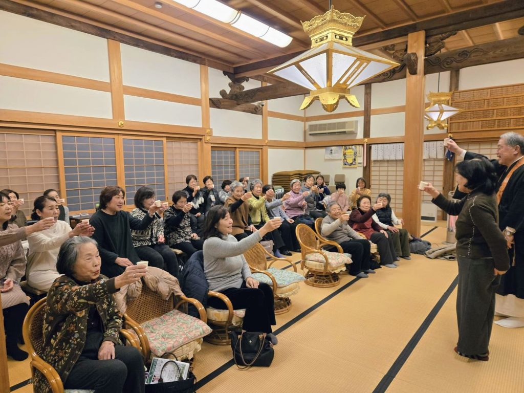 いつもの様に正信偈のお勤めのあと、新年のご挨拶、会長さんの音頭で乾杯です。今回は暫く撮ってなかった記念写真をパチリ!皆さんお元気です。