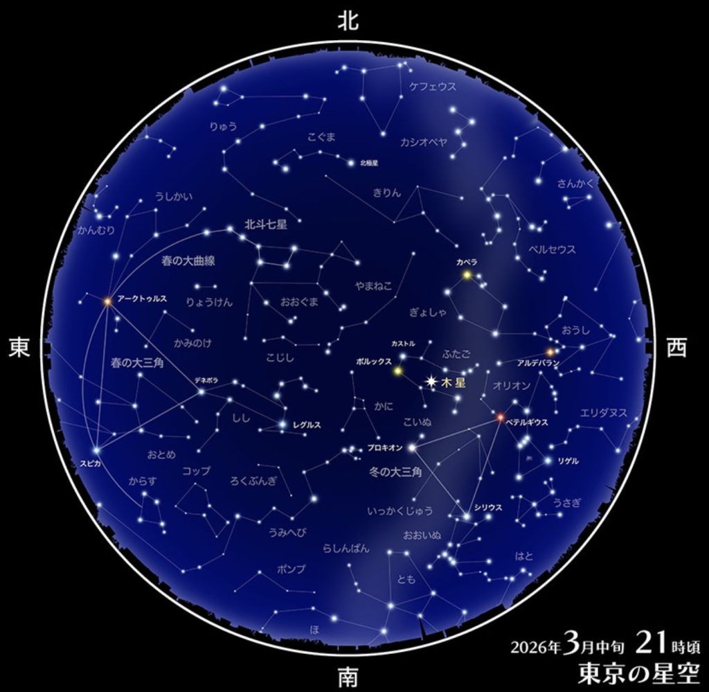 暗くなった宵の時間帯には、天頂から南の空にかけて、オリオン座を中心に冬の星座を彩る明るい星々が多く見られます。中でもふたご座近く、高い空でひときわ明るく輝いているのが木星です。 また1月から2月は、南に低く見つけづらい、りゅうこつ座の1等星カノープスを観察するのに良い時期です。南の地平線ギリギリに見える星でチャンスは短時間ですが挑戦してみましょう。