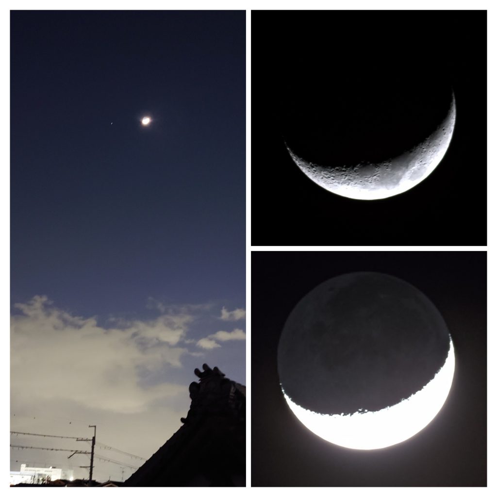 01月11日🌗下弦の月 (未明に南に見える左半月、朝西空に白い残り月)